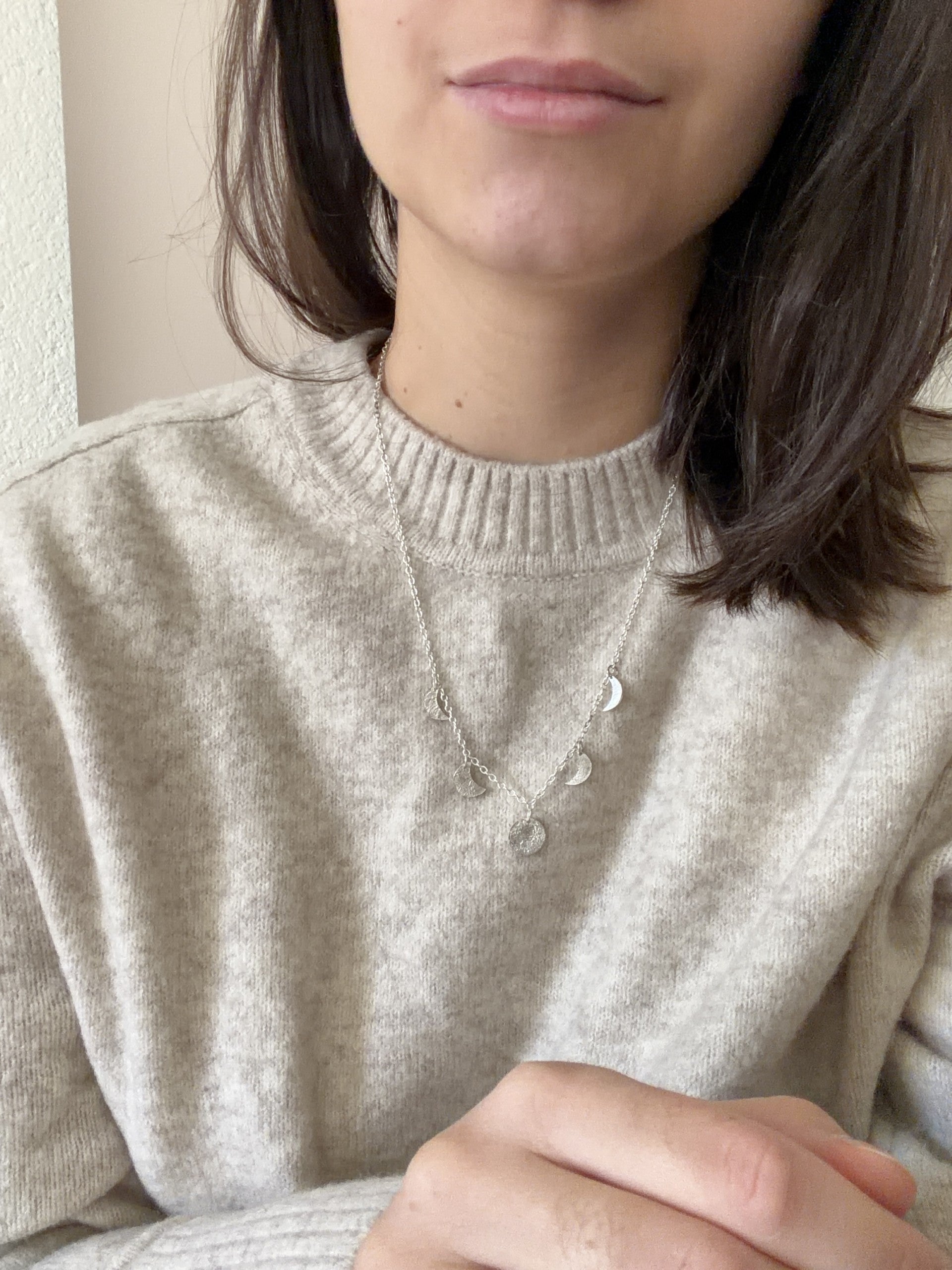 Pour les amoureuses et sensibles, ce collier représente votre part de féminité. La lune agit dans notre vie, sur nos humeurs, parfois notre sommeil mais aussi sur les marées de nos océans. Ce collier symbolise les différentes phases de la lune.Je fabrique chaque bijou à la main avec amour, dans mon atelier situé au coeur des volcans d'Auvergne. Chaque bijou est fabriqué un à un avec les techniques traditionnelles de la bijouterie/joaillerie.